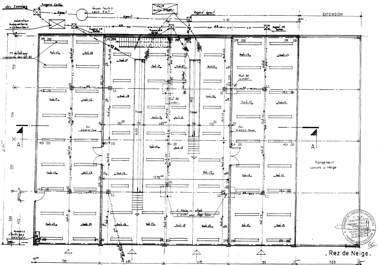 Le bâtiment est composé de 5 travées d'environ 7,00m pour un total de 35,50m X 22,44m de profondeur.