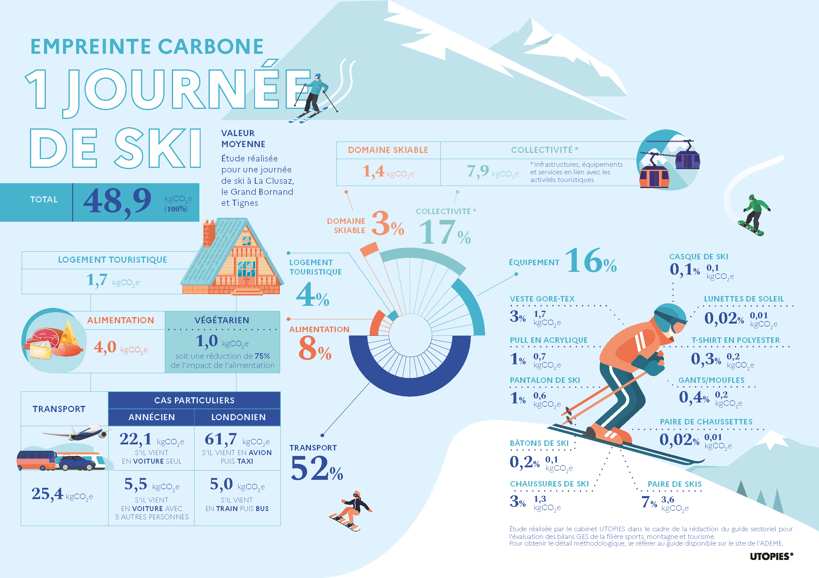 « L’empreinte carbone de n’importe quel séjour en montagne, au ski ou autre, est avant tout impactée par le mode de transport : en moyenne – soit pour les trois domaines considérés – quatre annéciens auront une empreinte plus importante en allant skier en véhicule personnel à la journée qu’un Londonien qui vient passer une semaine en train puis bus (5,5 kgCO2e par personne pour le trajet, contre 5,0 kgCO2e pour le trajet ramené par jour pour le voisin d’outre-Manche). En revanche, si ce dernier vient en avion puis voiture, son empreinte liée aux transports passe pour le même séjour à 62 kgCO2e ! » analyse Pierre Viard, expert en mesure d’impacts chez UTOPIES et co-auteur du guide.